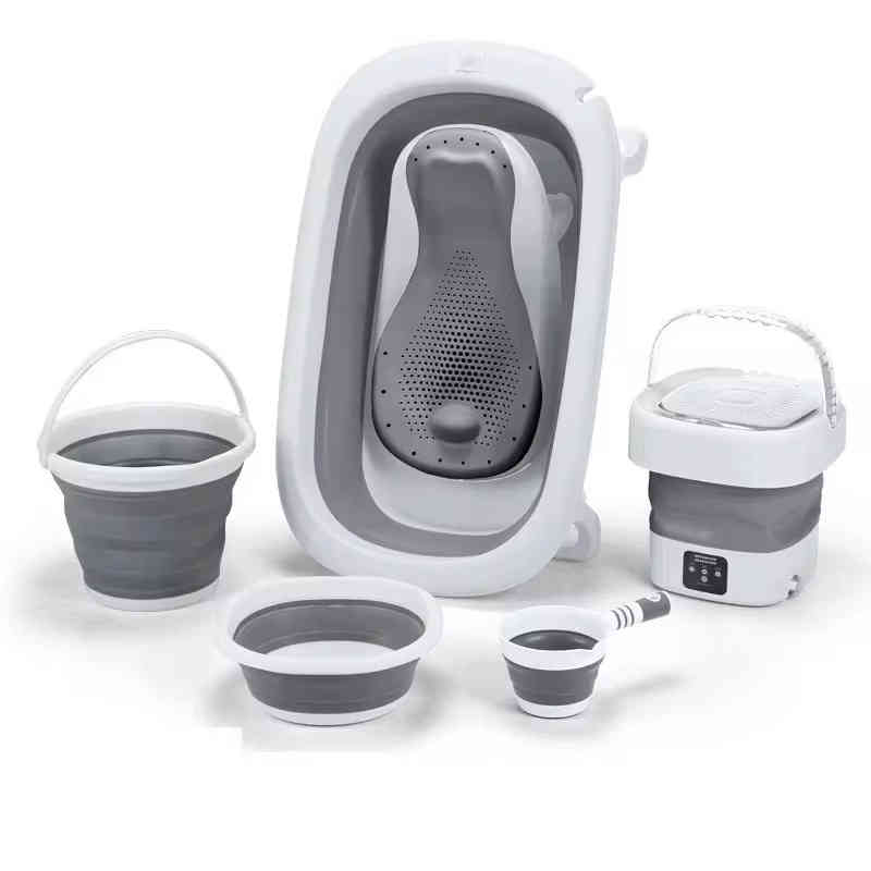 Ce kit complet comprend plusieurs accessoires utiles pour le bain et le rinçage, y compris une mini machine à laver portable, idéale pour laver les petits vêtements de bébé.