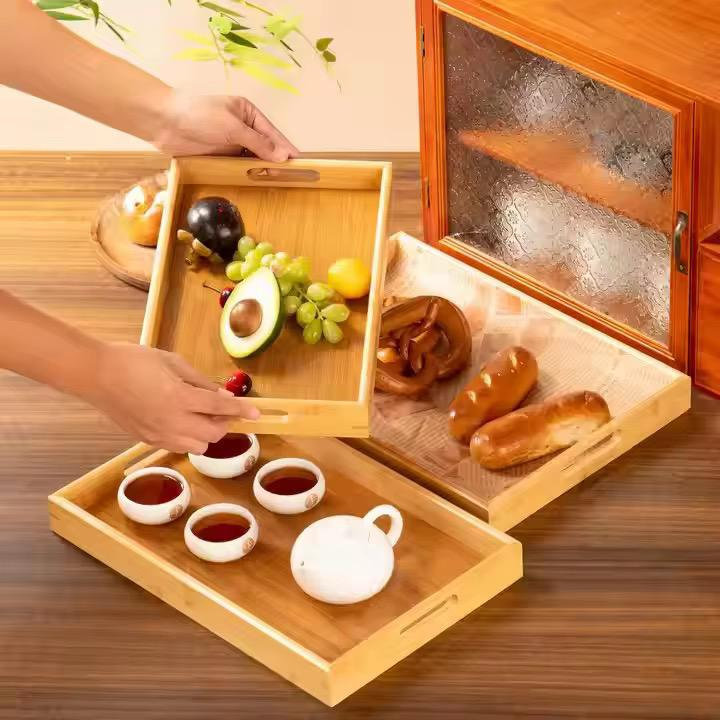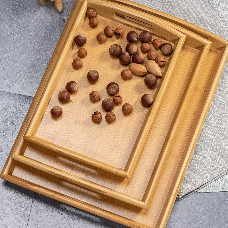 Set de plateaux de service en bois 3 en 1 avec poignées découpées, empilables, élégants et pratiques.